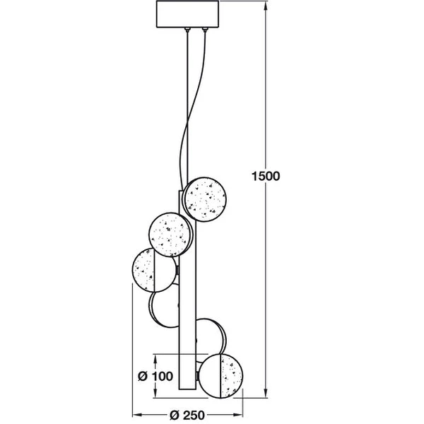 The ceiling pendant is a circular design ceiling plate with thin suspension wires holding a frame with 6 globe-shaped shades.