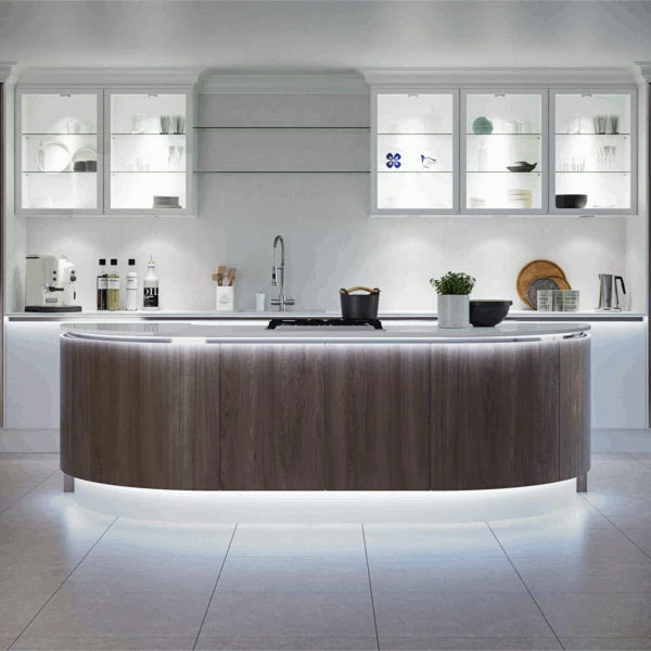 New from Sycamore Lighting is the cleverly designed FLEXile LED strip. It can be bent around most tight curves and gives illumination on the vertical and horizontal planes. This LED striplight is perfect for illuminating curved units & island or going around corners.