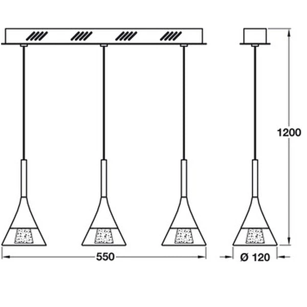 - Material: Metal ceiling plate, suspension wires and glass shades