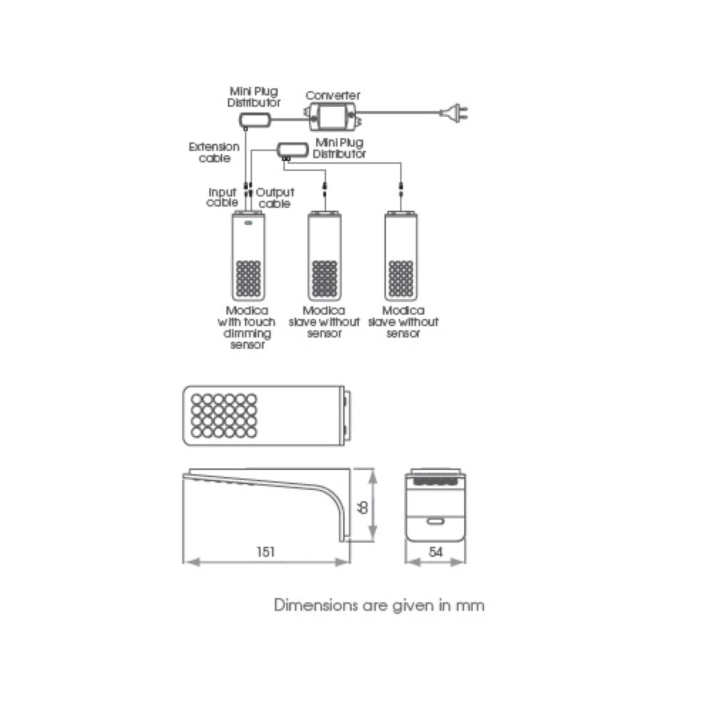 Light Supplier’s Modica LED Under Cabinet light is high quality and stylish, available with a touch dimming feature if required The Modica Under Cabinet Light with a sensor can be used in conjunction with the Modica non-sensor light to make a master and slave system. The Modica light can also be used as a stand-alone version.