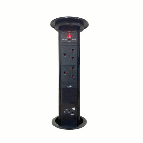 New for 2022 from SycamoreLED come the new range of Fully motorised pop up sockets with Qi charging and Bluetooth Speakers, with its black glass finish top it will add a stuffing addition to any kitchen worksurface.