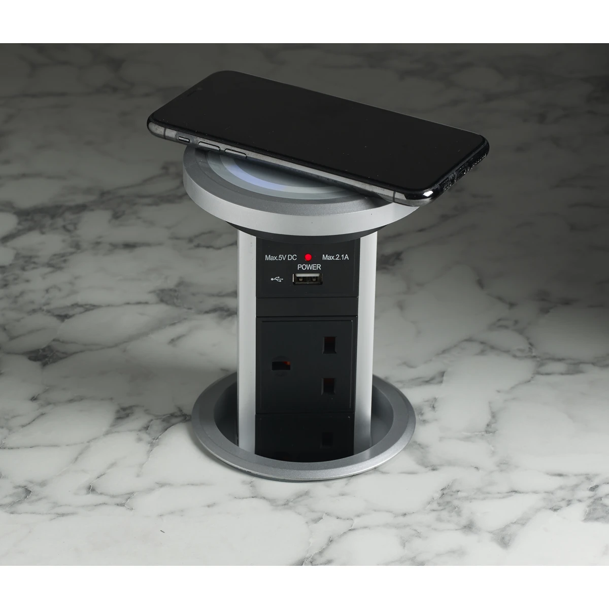 New from Leyton Lighting this motorised pop up socket with Qi and USB charging is ideal for any kitchen or office space with its sleek design and is finished in a silver finish