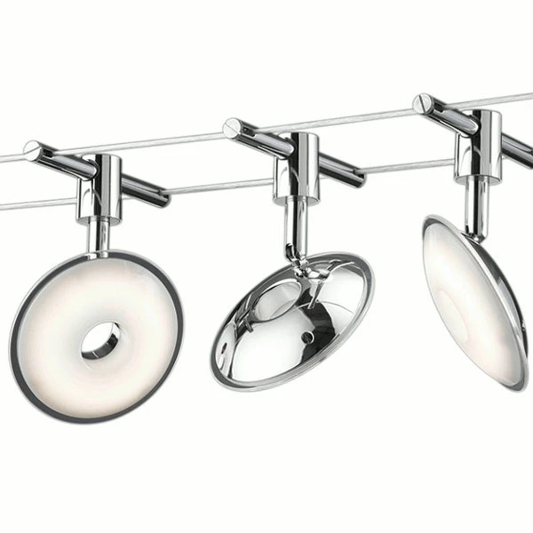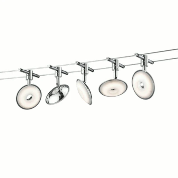 This ultra modern and contemporary LED Track spotlight kit from Leyton Lighting is an ideal low energy LED lighting solution for the home. The Pilatus Modern is a circular shaped 5 light LED kit with adjustable head position, allowing the stylish LED non-dimmable warm white lighting beam to be modified. This LED ceiling light comes in a fashionable chrome finish including a track cable system with a maximum 5-metre range.