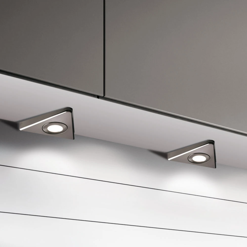Our New Sirius under cabinet flat triangle light has unique characteristics which make it one of our most popular lights. With a 4000-4500K natural white LED giving out an excellent light effect, illuminating a worksurface perfectly. This cabinet light is fitted with a diffused cover enabling the LED’s to be hidden from view and giving out a lighting effect far superior to any halogen lighting, whilst also giving you a cost-effective energy saving light. The bean angle of this light enables all dark spots to be removed giving you an even spread over your surface.