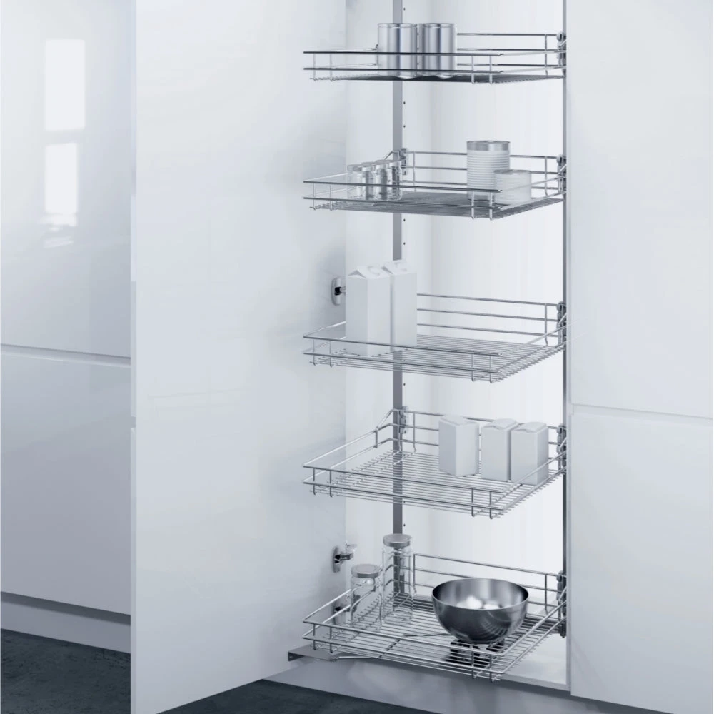 The VSA Swing Out Larder Units are easy to use; the baskets are pulled out of the cabinet at the same time as the door is opened. Baskets can be individually positioned at the required height in the cabinet frame.