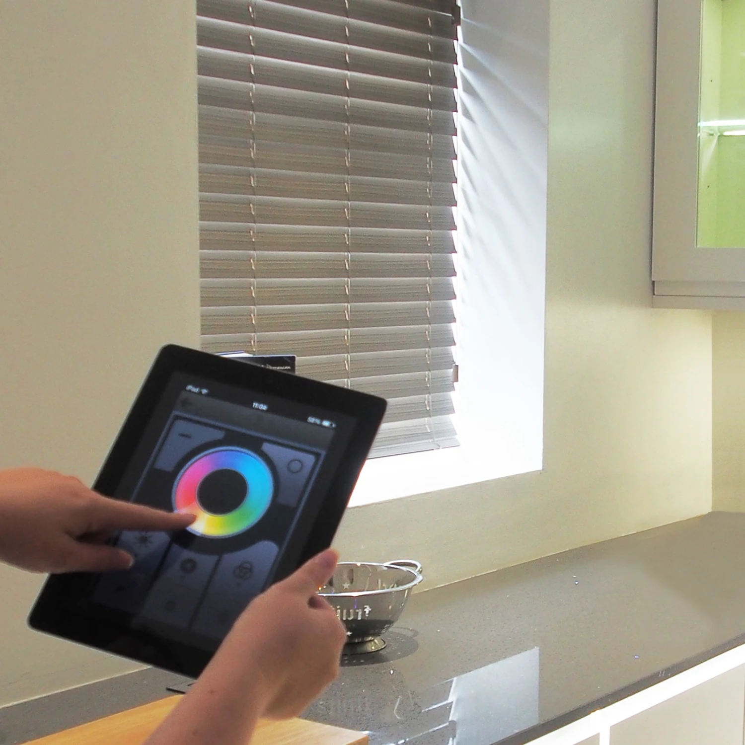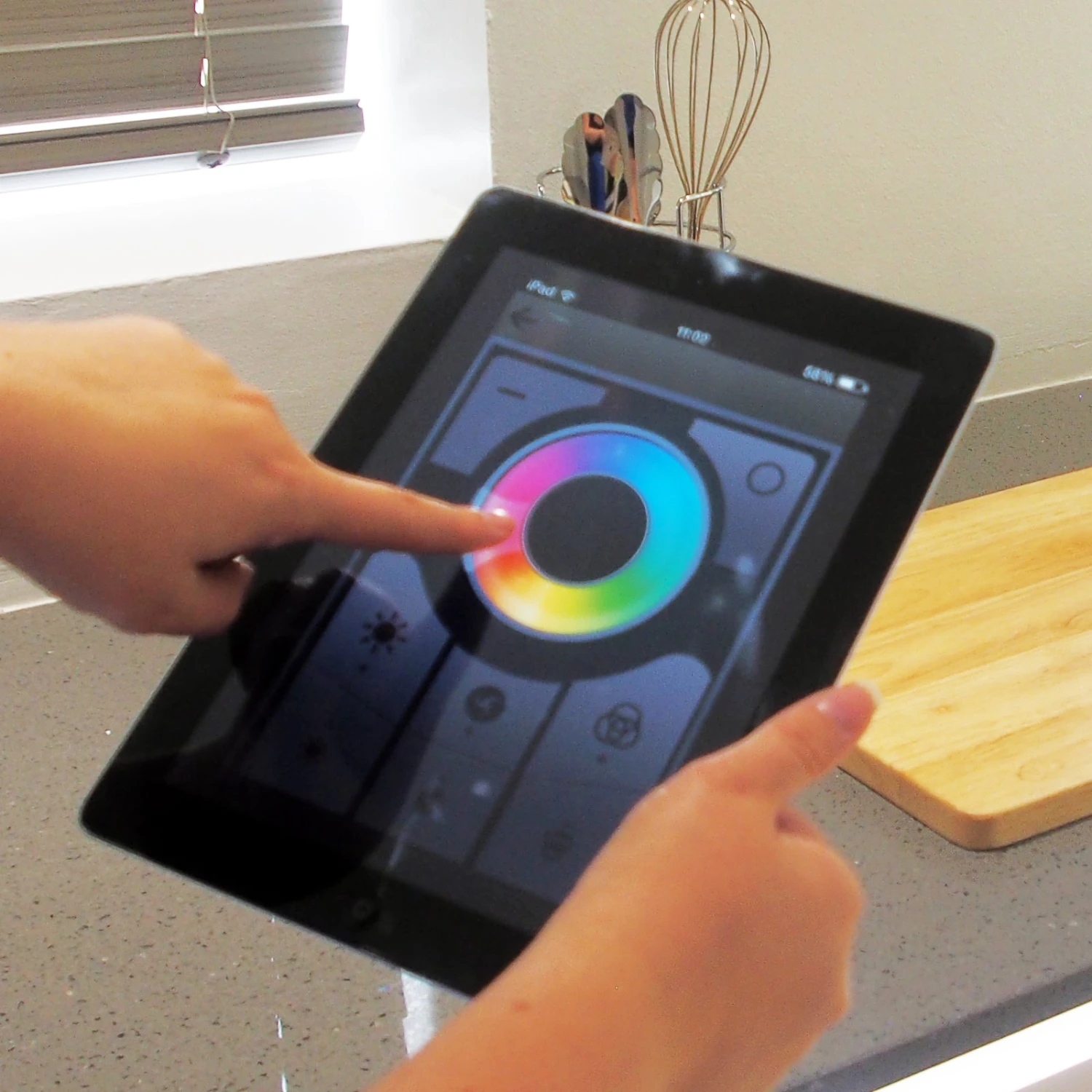 Our innovative new WiFi module allows wireless control of multiple LED lights in the palm of your hand. The WiFi controller hub is compatible with our 12Vdc LED lights so you can control your cabinet lights, plinth lights, strip lighting or any other 12Vdc lighting using your iOS 5.0 smart phone or tablet, by downloading the app, which is free via the Apple store or Android Google Play.